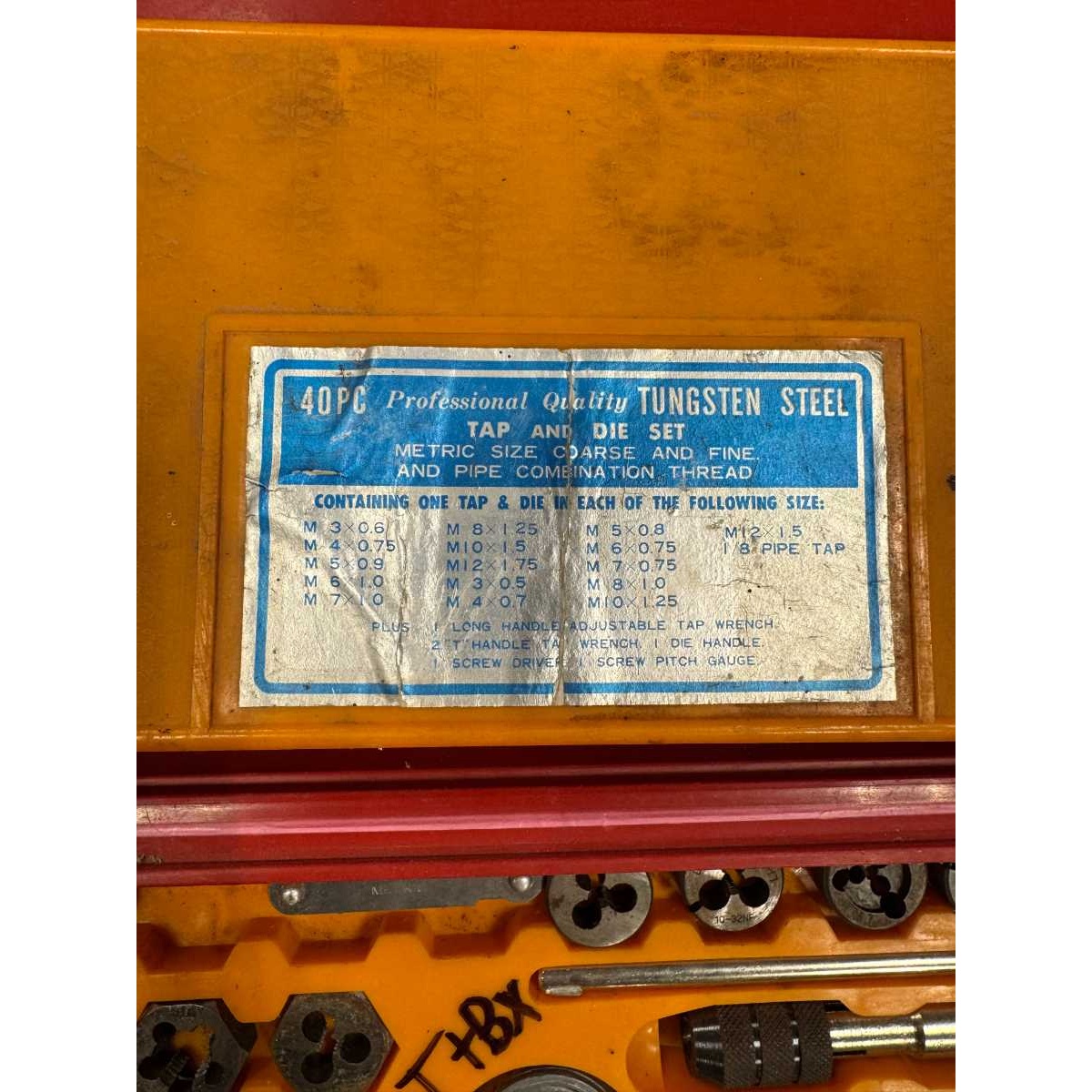 40 pc professional quality tungsten steel tap and die set. Metric size coarse and fine and pipe combination thread